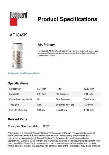 Fleetguard® AF1845K axial seal primary air filter ensures a proper seal and prevent leaks to prevent airborne contaminants from reaching the combustion chamber.Specification