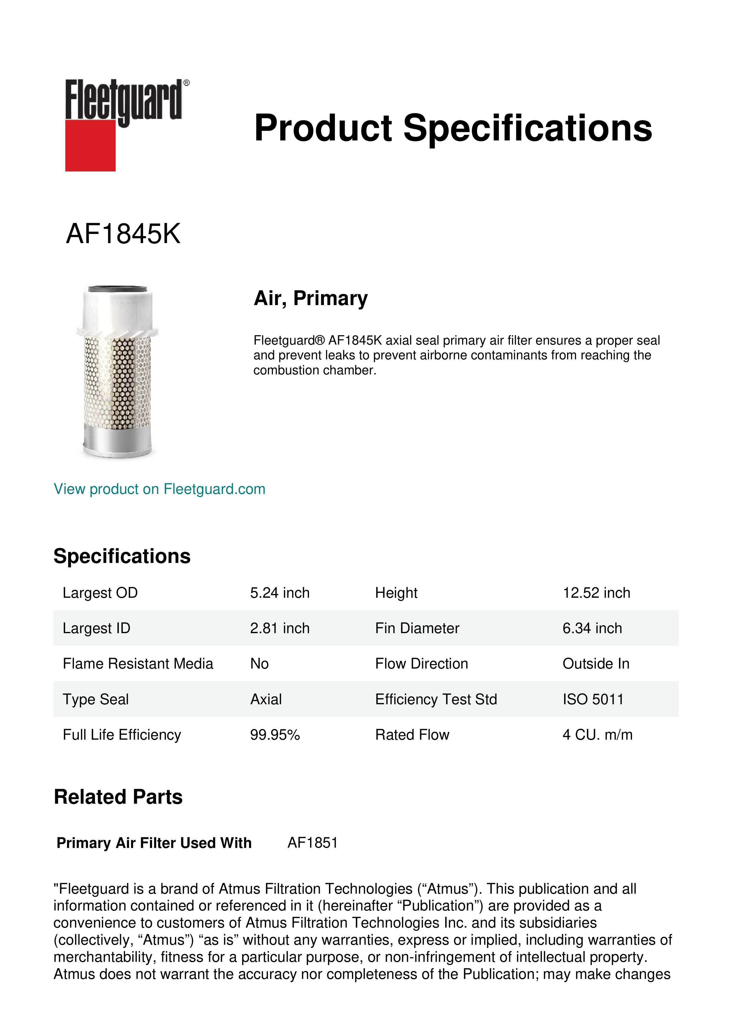 Fleetguard AF1845K Air, Primary