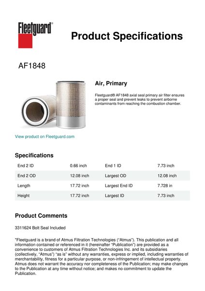 Fleetguard® AF1848 axial seal primary air filter ensures a proper seal and prevent leaks to prevent airborne contaminants from reaching the combustion chamber.