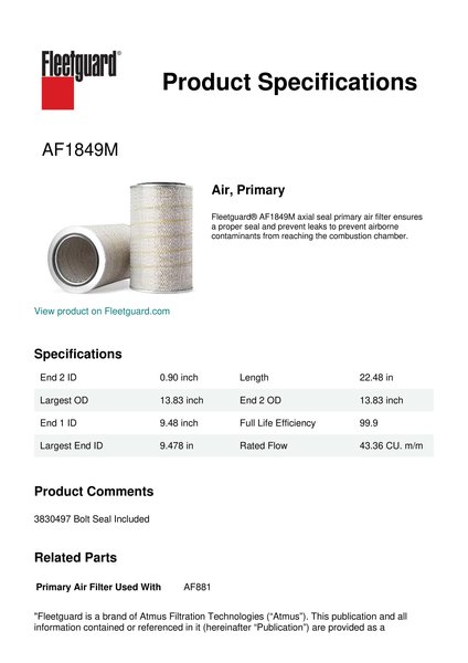Fleetguard® AF1849M axial seal primary air filter ensures a proper seal and prevent leaks to prevent airborne contaminants from reaching the combustion chamber.