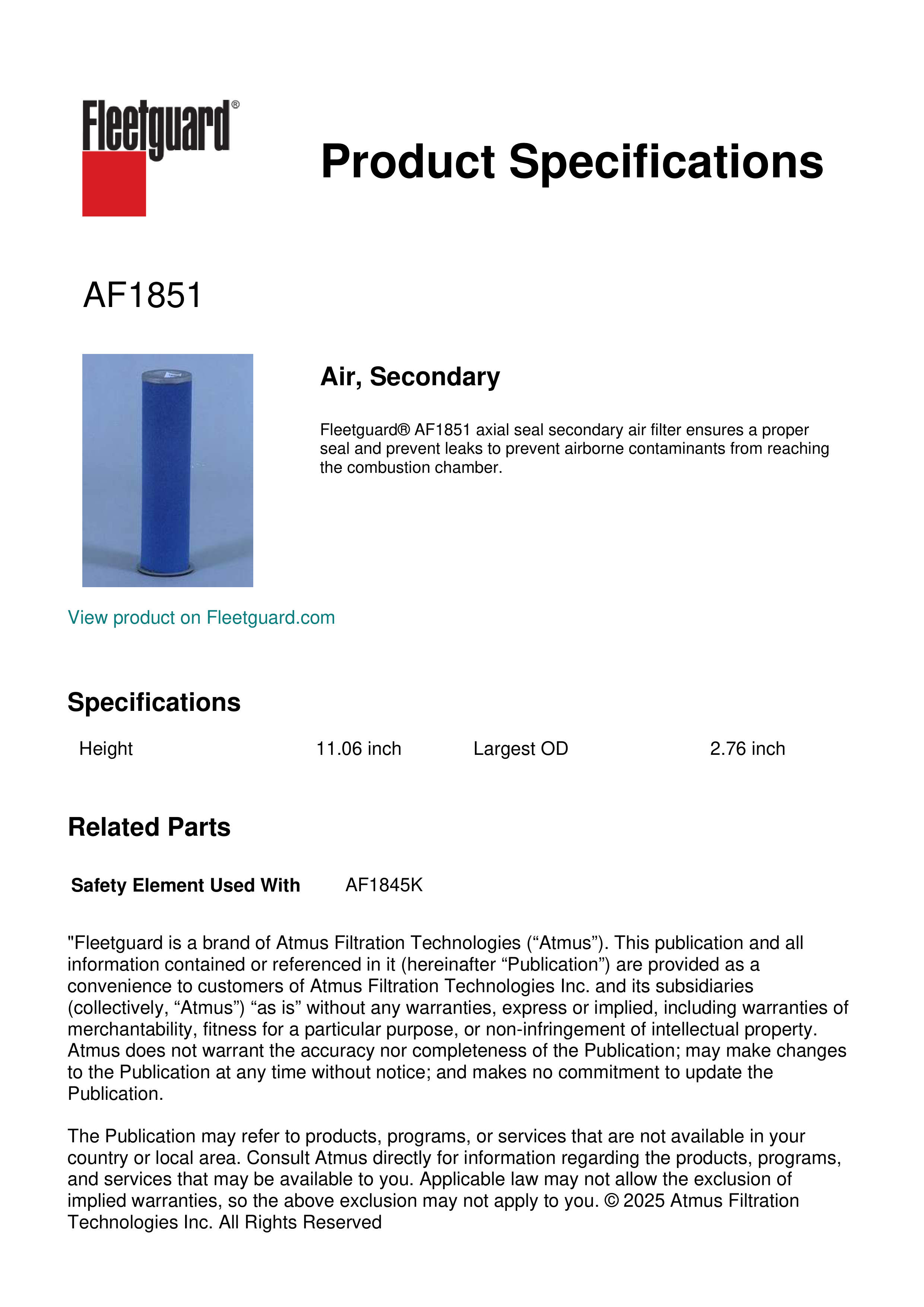 Fleetguard® AF1851 axial seal secondary air filter ensures a proper seal and prevent leaks to prevent airborne contaminants from reaching the combustion chamber.