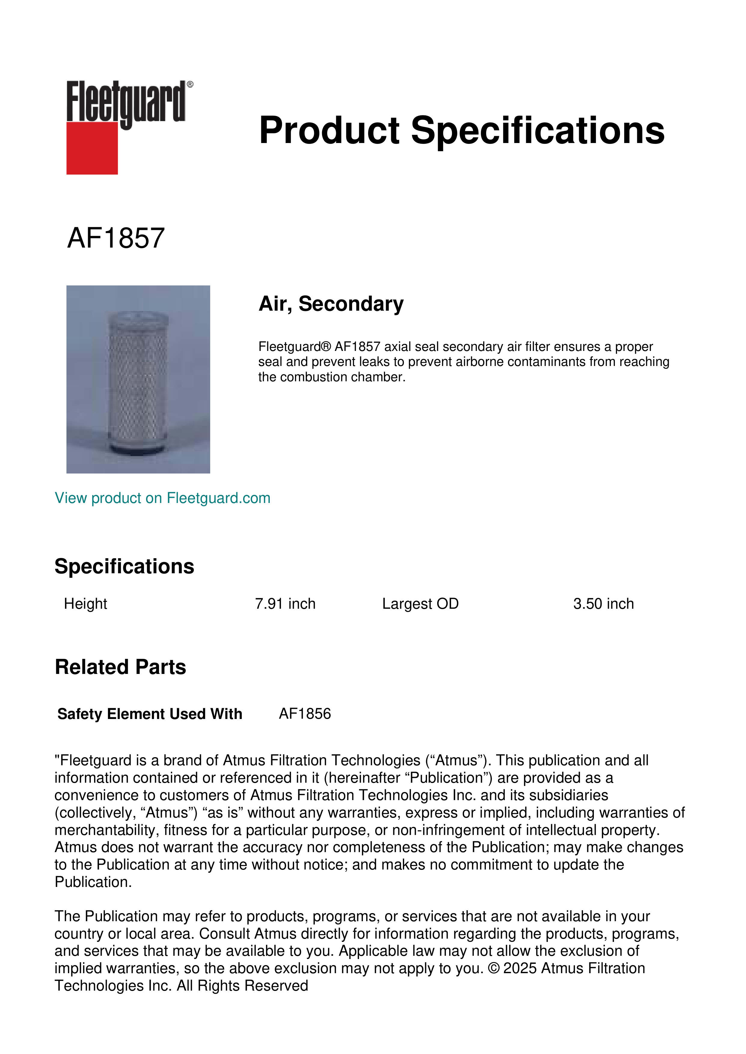 Fleetguard AF1857 Air, Secondary