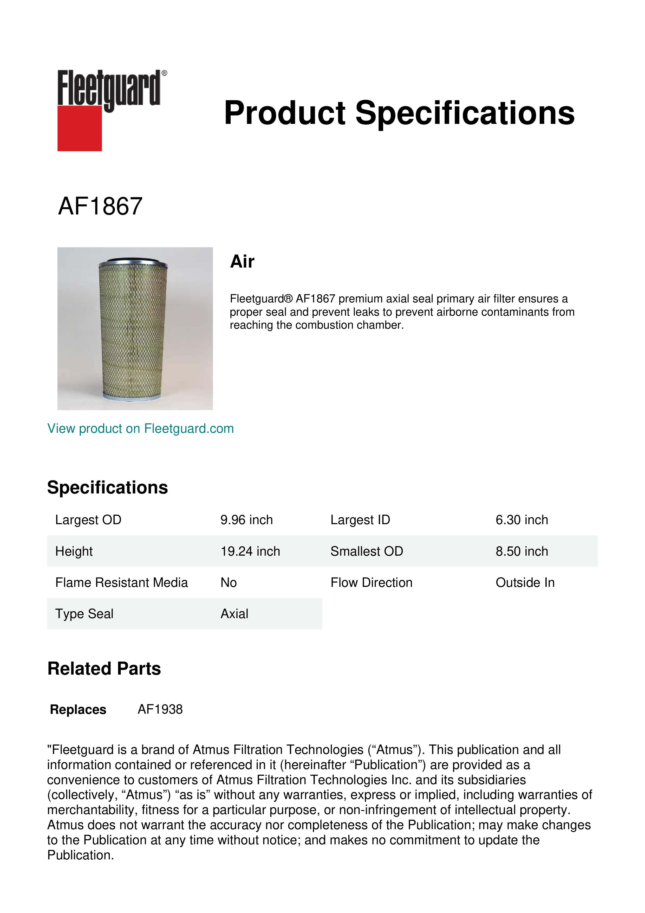 Fleetguard® AF1867 premium axial seal primary air filter ensures a proper seal and prevent leaks to prevent airborne contaminants from reaching the combustion chamber.Specification