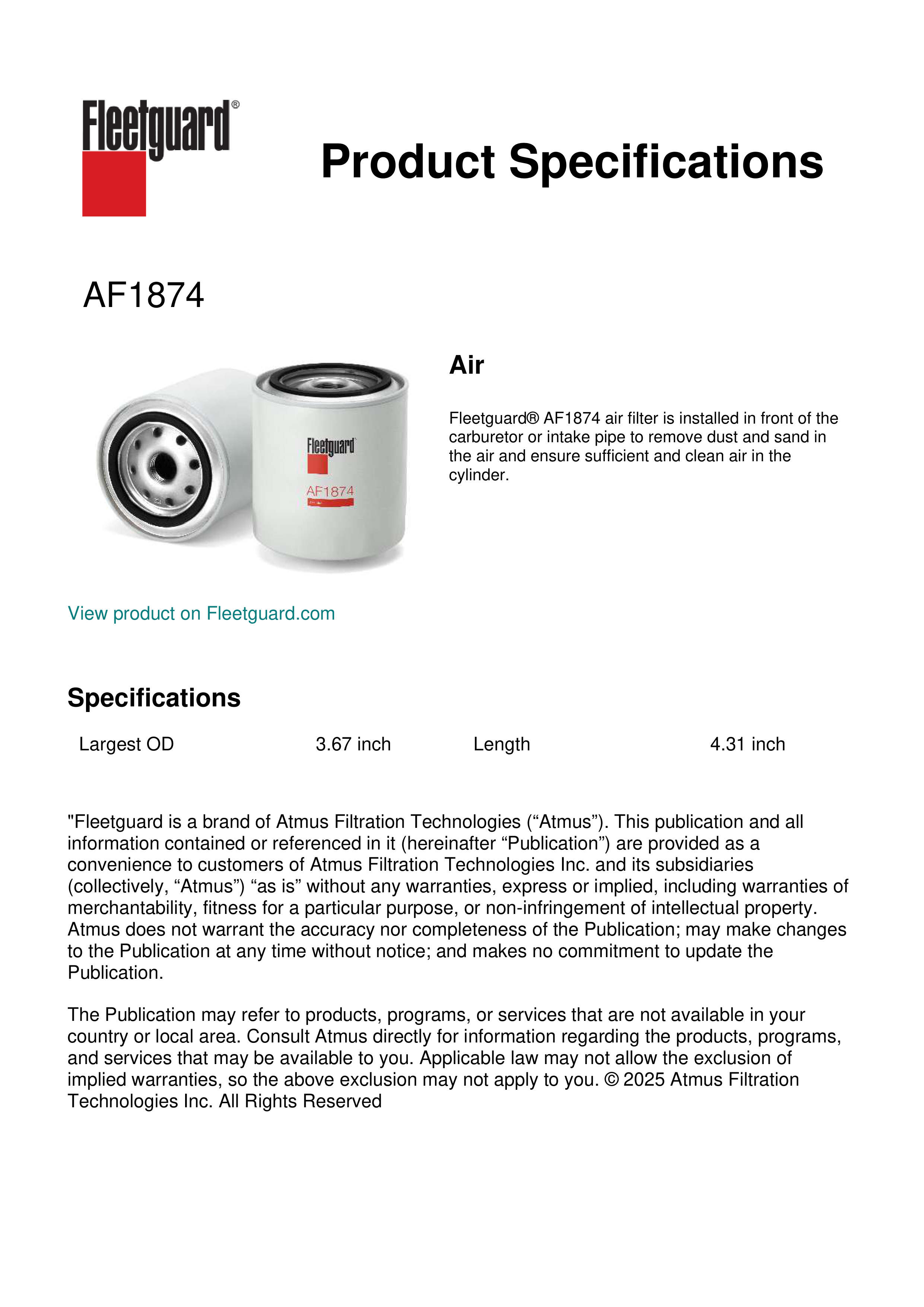 Fleetguard® AF1874 air filter is installed in front of the carburetor or intake pipe to remove dust and sand in the air and ensure sufficient and clean air in the cylinder.Specification