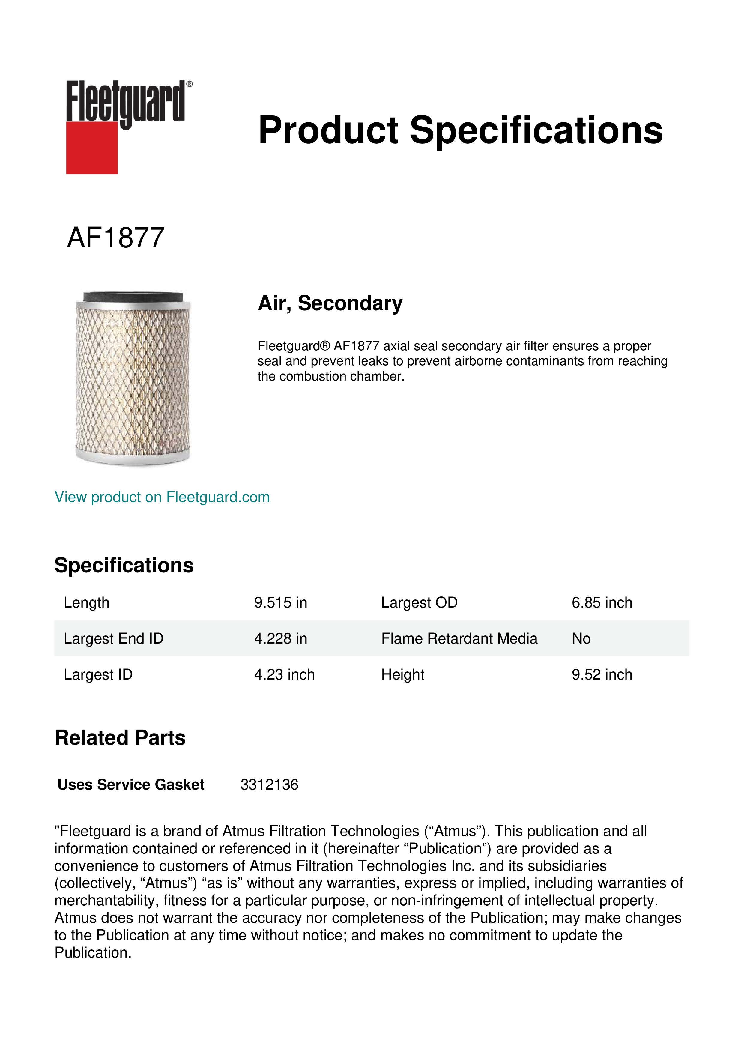 Fleetguard® AF1877 axial seal secondary air filter ensures a proper seal and prevent leaks to prevent airborne contaminants from reaching the combustion chamber.Specification