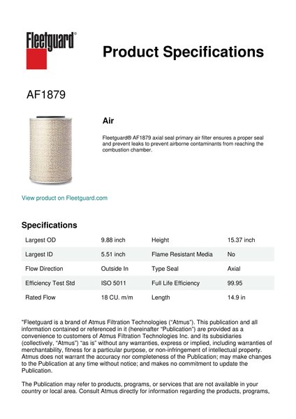 Fleetguard® AF1879 axial seal primary air filter ensures a proper seal and prevent leaks to prevent airborne contaminants from reaching the combustion chamber.Specification