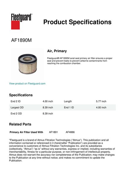 Fleetguard® AF1890M axial seal primary air filter ensures a proper seal and prevent leaks to prevent airborne contaminants from reaching the combustion chamber.Specification