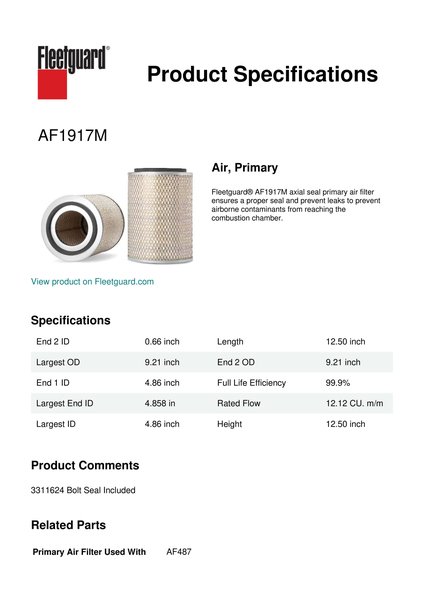 Fleetguard® AF1917M axial seal primary air filter ensures a proper seal and prevent leaks to prevent airborne contaminants from reaching the combustion chamber.Specification