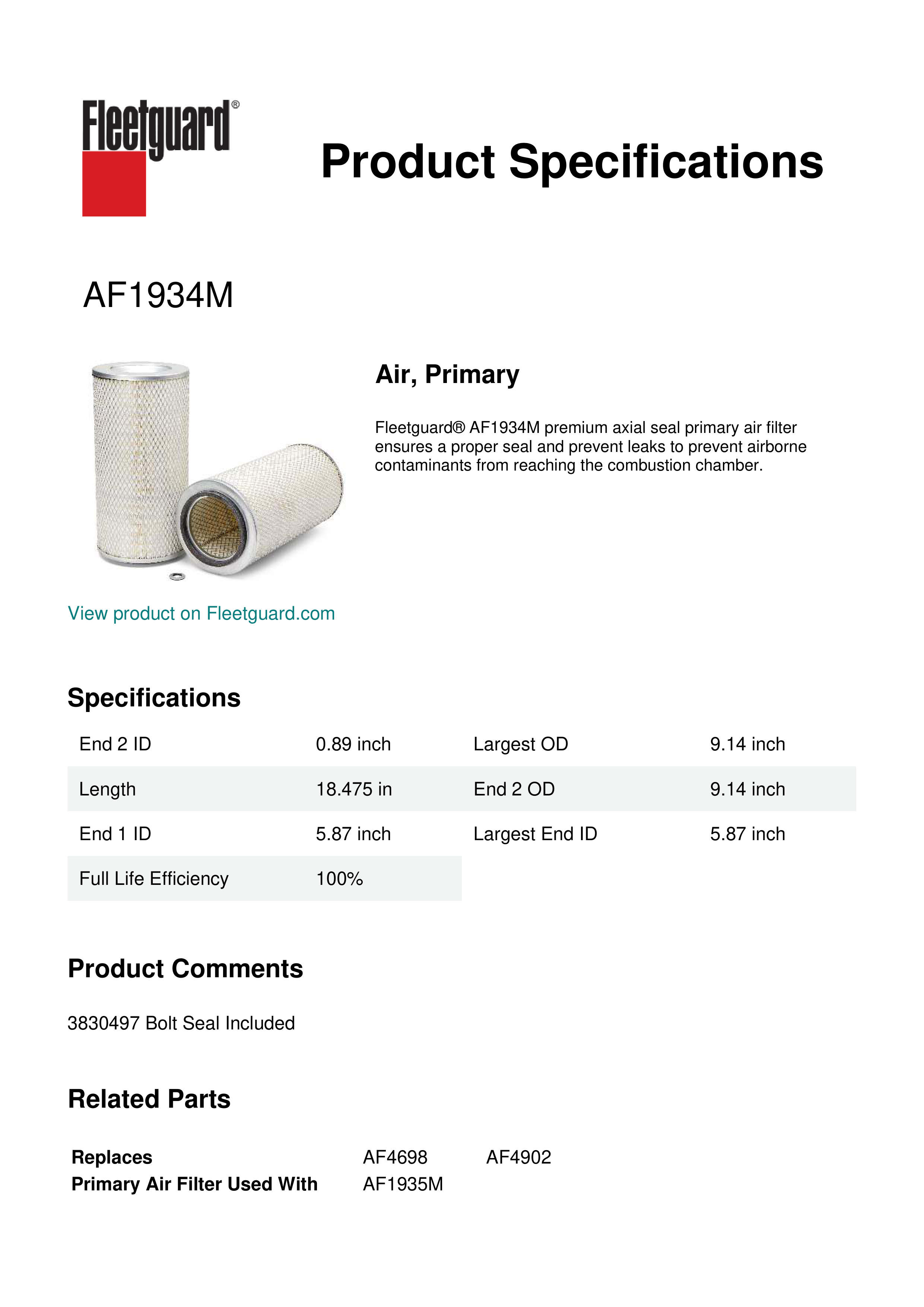 Fleetguard® AF1934M premium axial seal primary air filter ensures a proper seal and prevent leaks to prevent airborne contaminants from reaching the combustion chamber.
