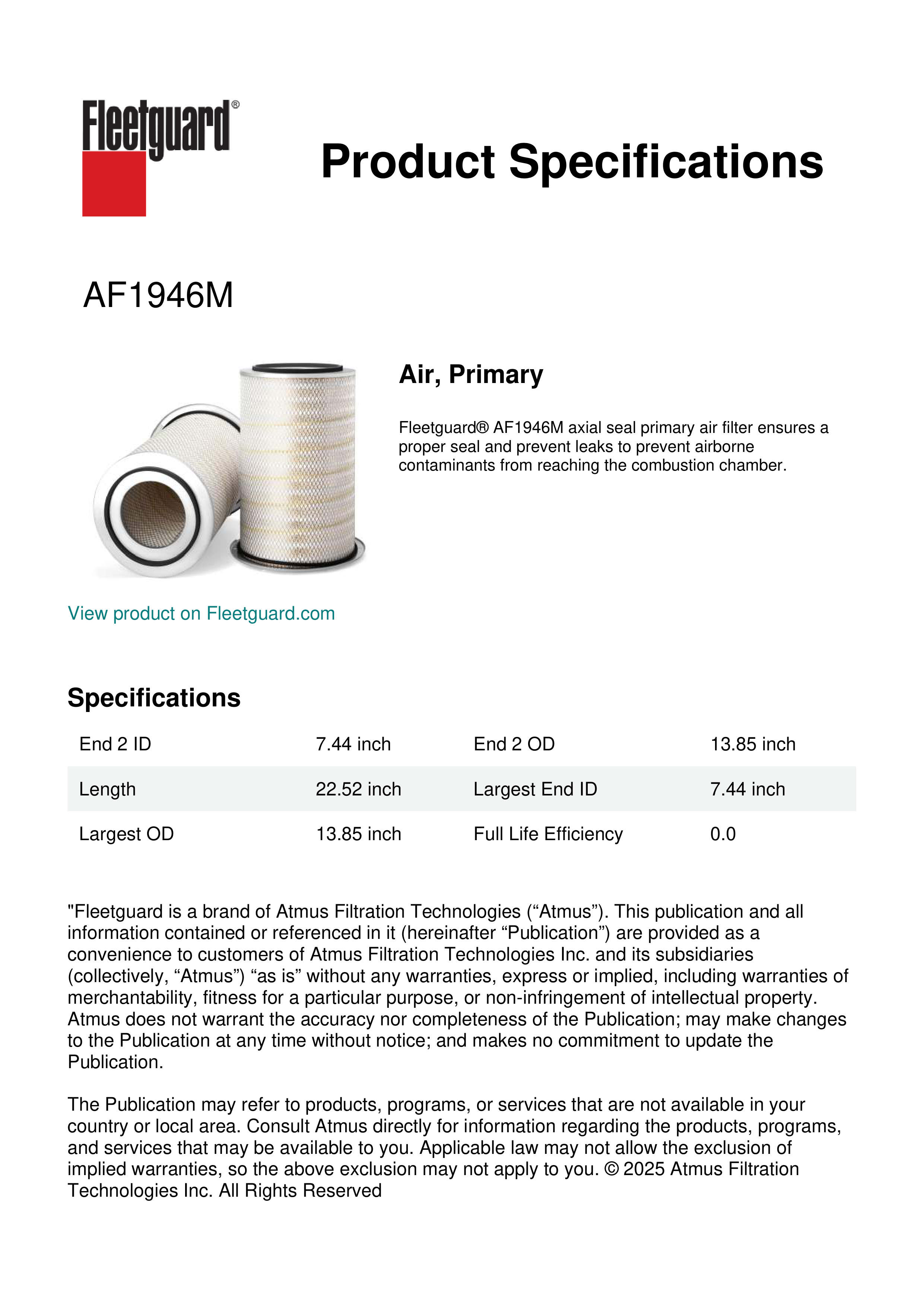 Fleetguard® AF1946M axial seal primary air filter ensures a proper seal and prevent leaks to prevent airborne contaminants from reaching the combustion chamber.Specification