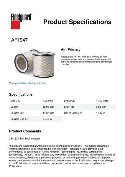 Fleetguard® AF1947 axial seal primary air filter ensures a proper seal and prevent leaks to prevent airborne contaminants from reaching the combustion chamber.