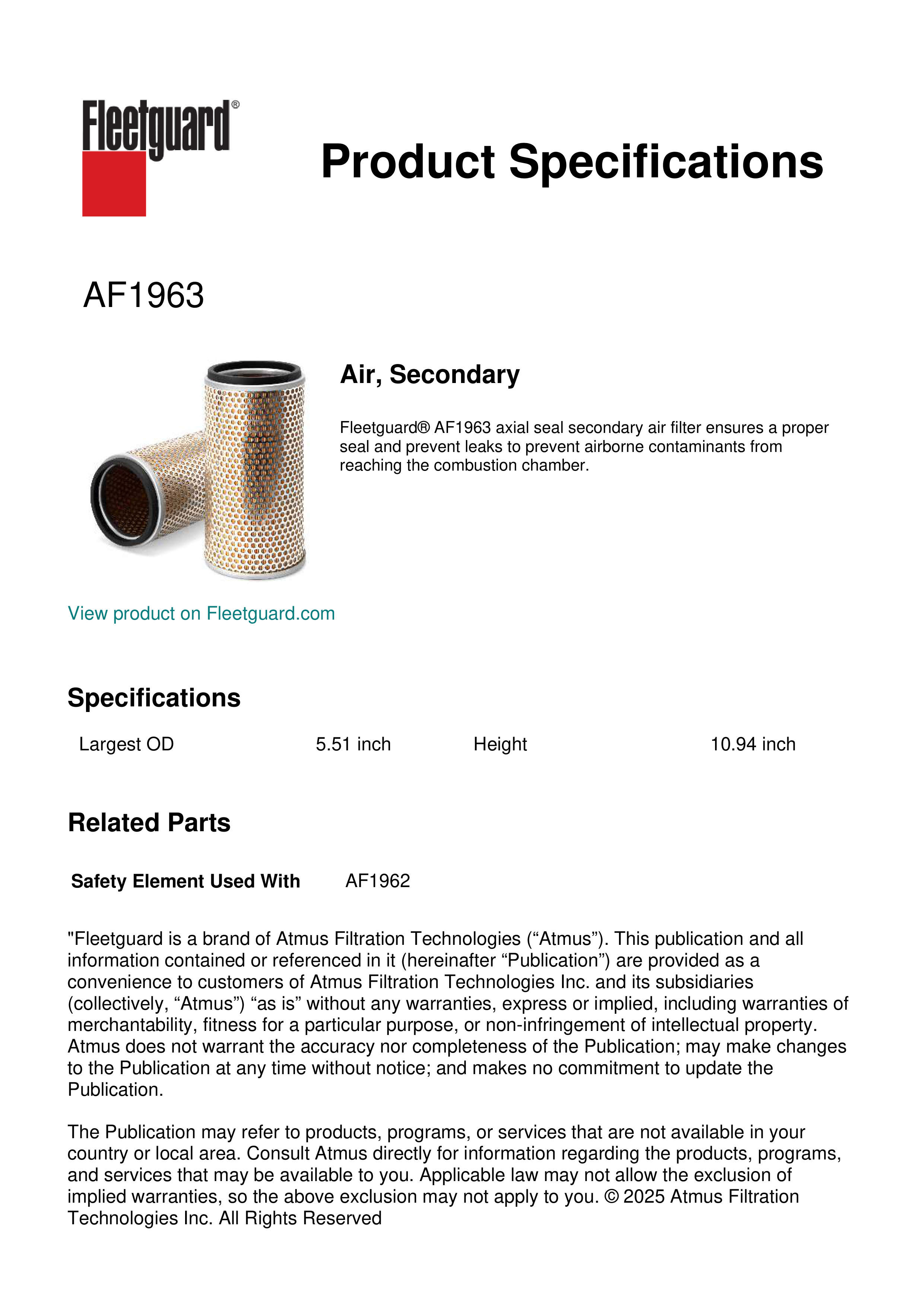 Fleetguard® AF1963 axial seal secondary air filter ensures a proper seal and prevent leaks to prevent airborne contaminants from reaching the combustion chamber.