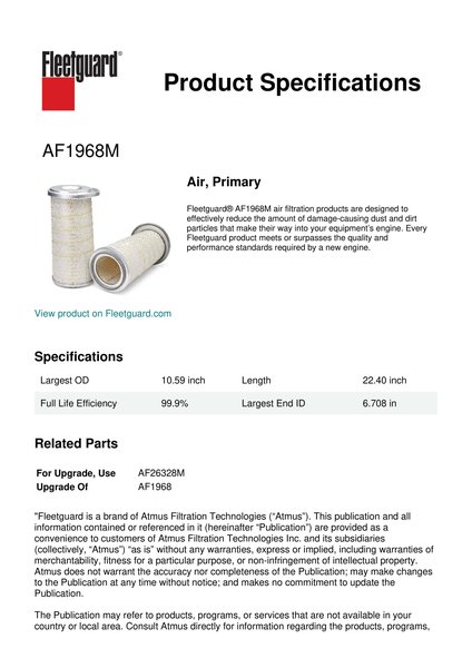Fleetguard® AF1968M air filtration products are designed to effectively reduce the amount of damage-causing dust and dirt particles that make their way into your equipment’s engine. Every Fleetguard product meets or surpasses the quality and performance standards required by a new engine.Specification