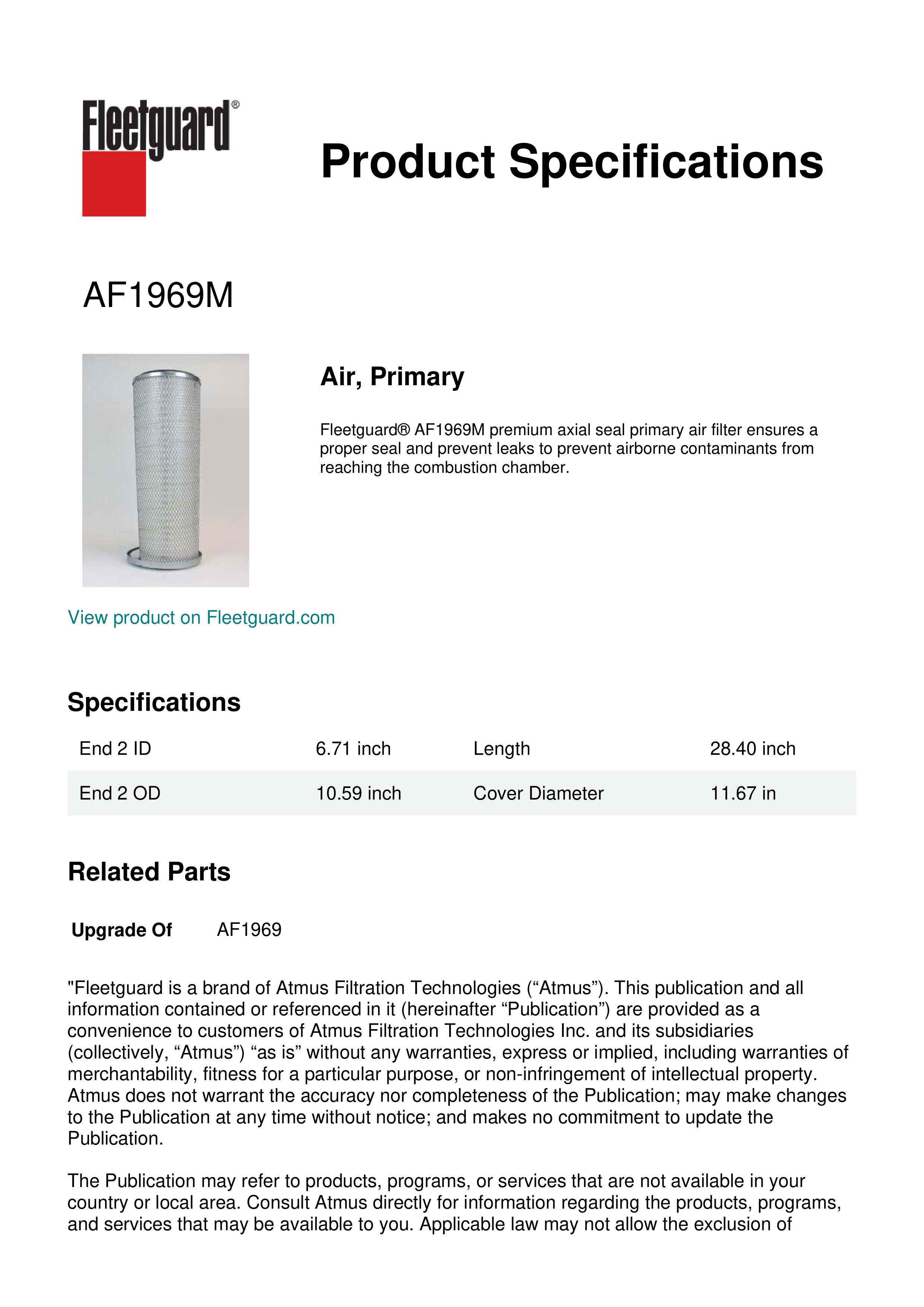 Fleetguard® AF1969M premium axial seal primary air filter ensures a proper seal and prevent leaks to prevent airborne contaminants from reaching the combustion chamber.Specification