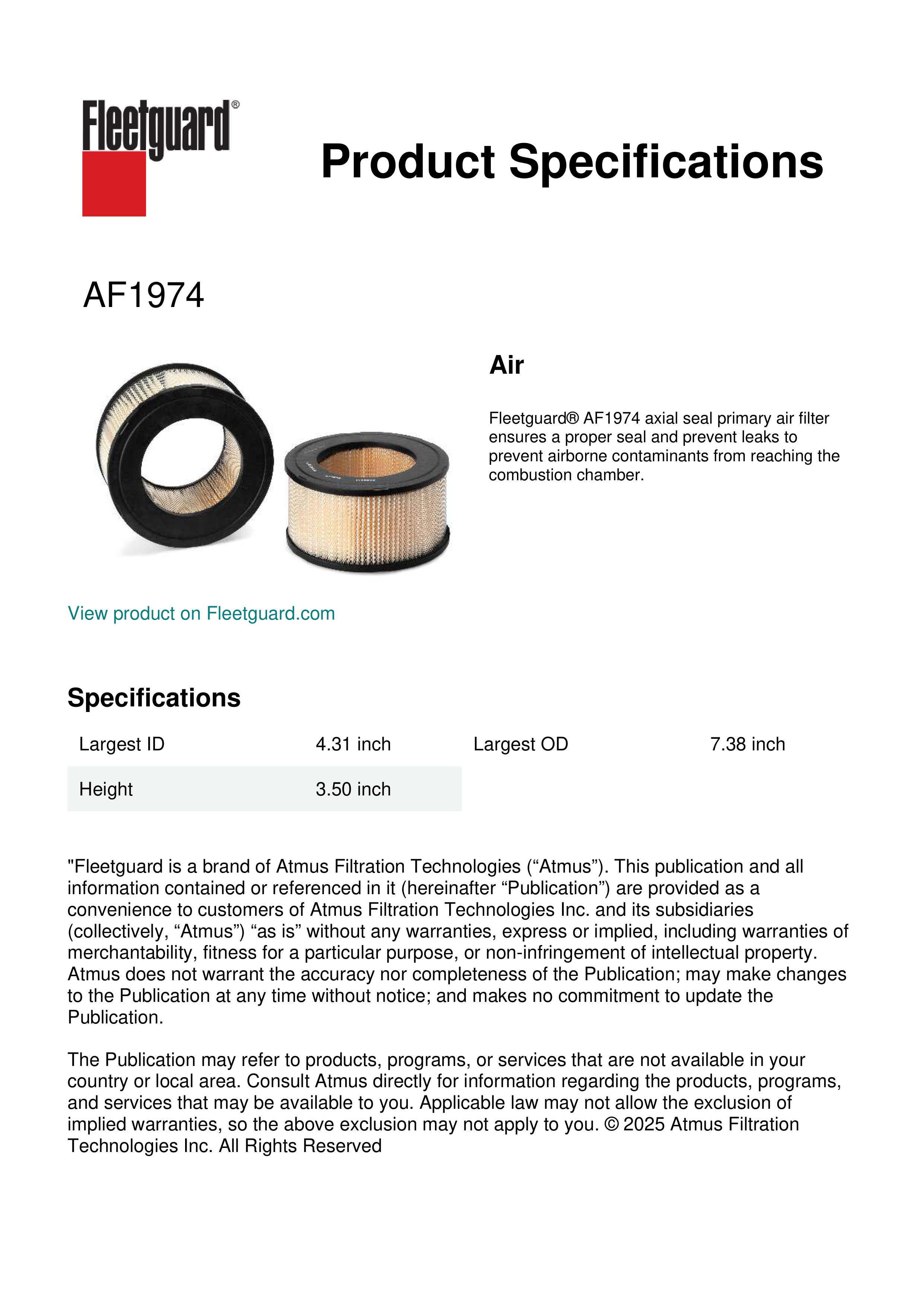Fleetguard® AF1974 axial seal primary air filter ensures a proper seal and prevent leaks to prevent airborne contaminants from reaching the combustion chamber.