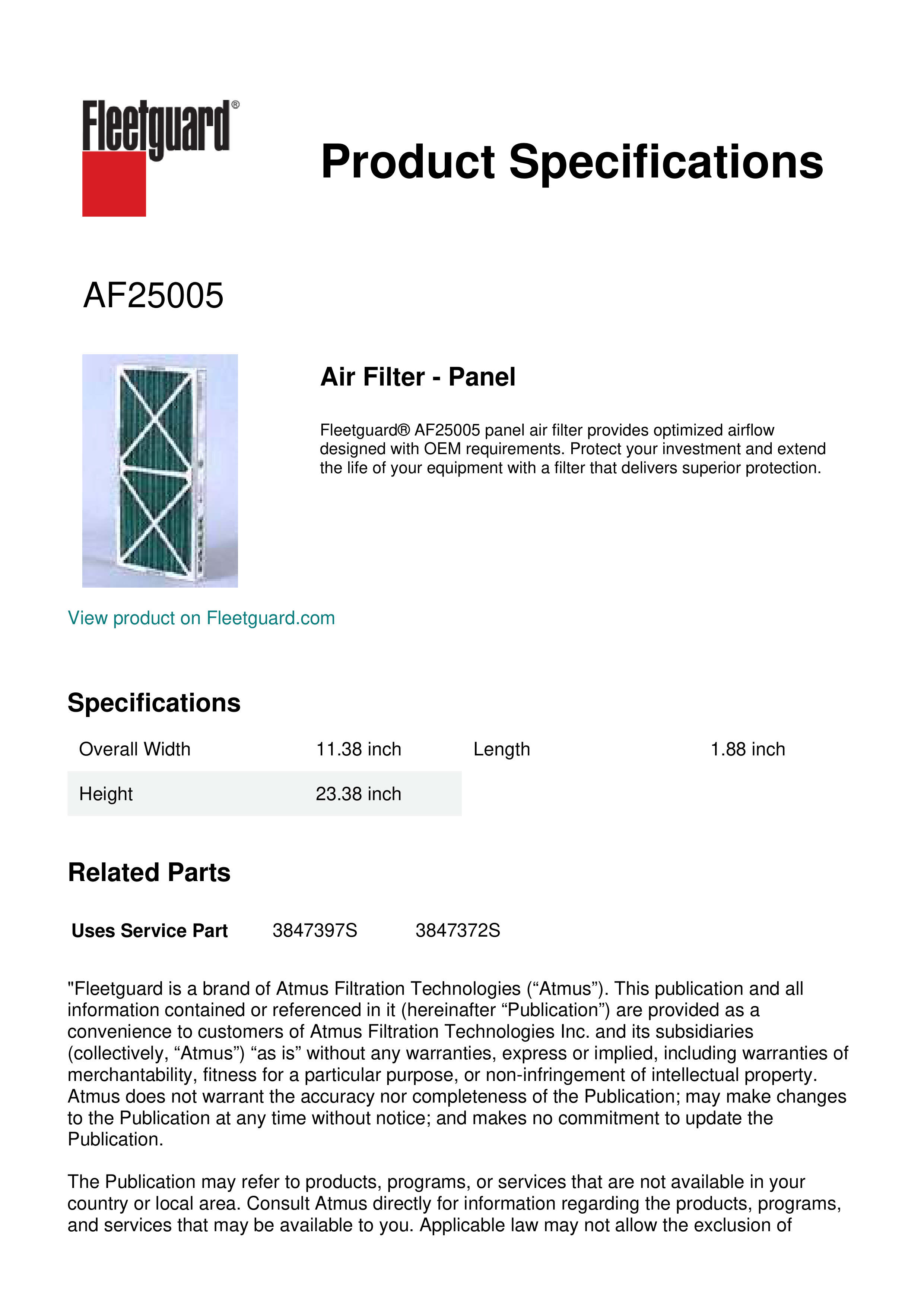 Fleetguard® AF25005 panel air filter provides optimized airflow designed with OEM requirements. Protect your investment and extend the life of your equipment with a filter that delivers superior protection.Specification