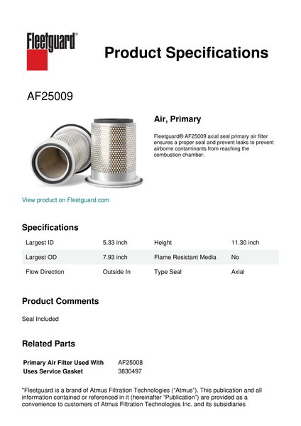 Fleetguard® AF25009 axial seal primary air filter ensures a proper seal and prevent leaks to prevent airborne contaminants from reaching the combustion chamber.
