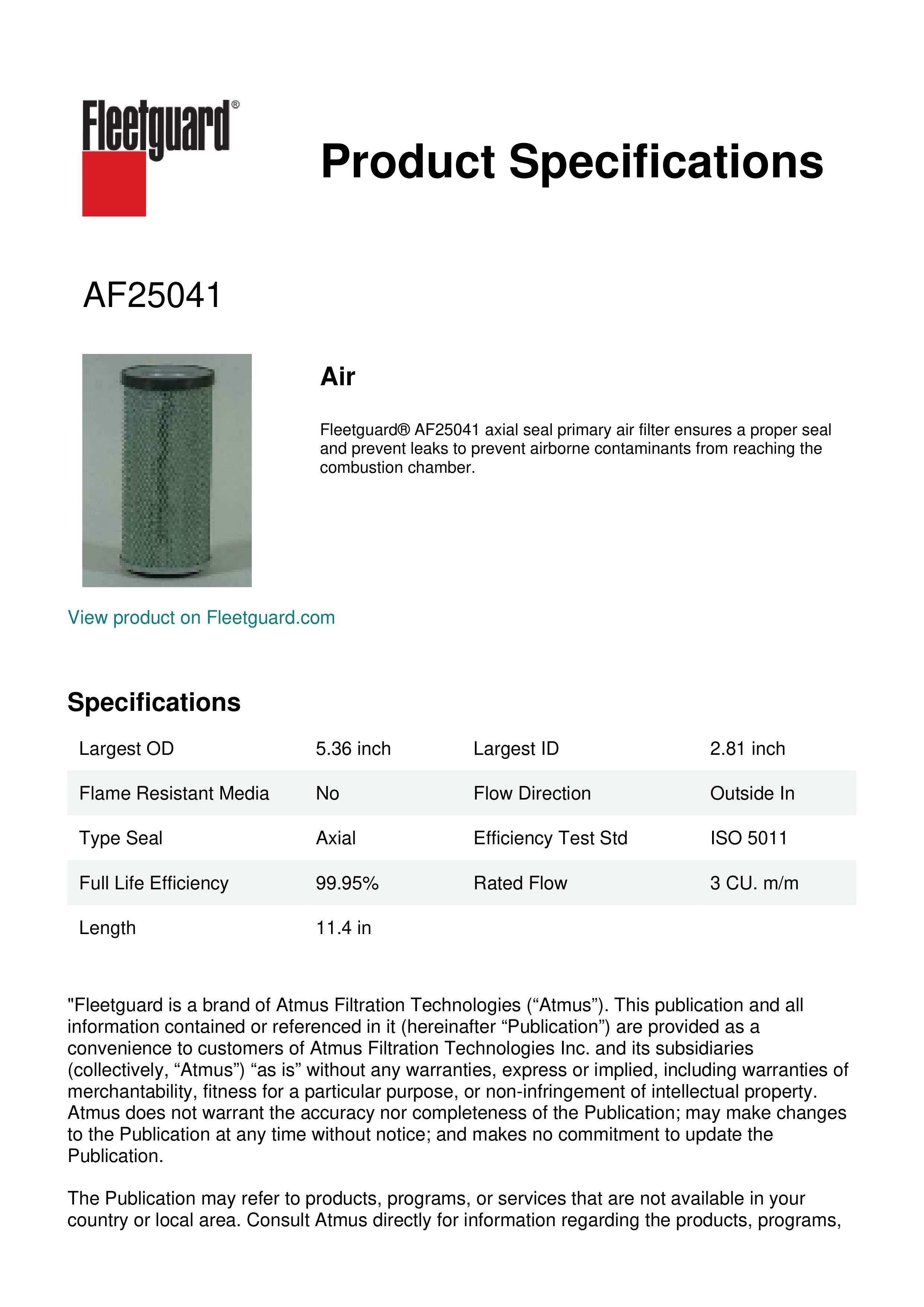 Fleetguard® AF25041 axial seal primary air filter ensures a proper seal and prevent leaks to prevent airborne contaminants from reaching the combustion chamber.