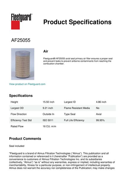 Fleetguard® AF25055 axial seal primary air filter ensures a proper seal and prevent leaks to prevent airborne contaminants from reaching the combustion chamber.