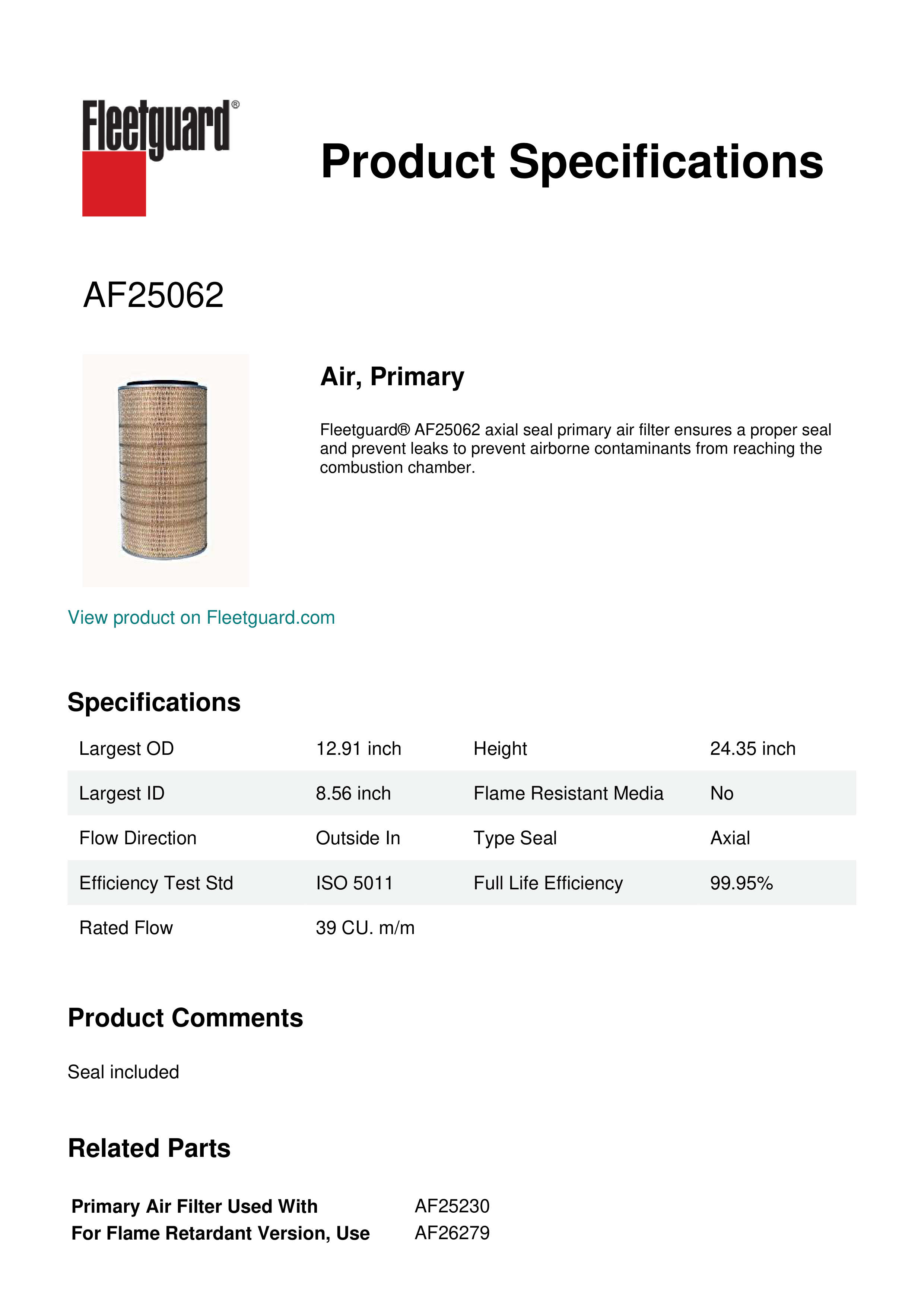 Fleetguard® AF25062 axial seal primary air filter ensures a proper seal and prevent leaks to prevent airborne contaminants from reaching the combustion chamber.Specification