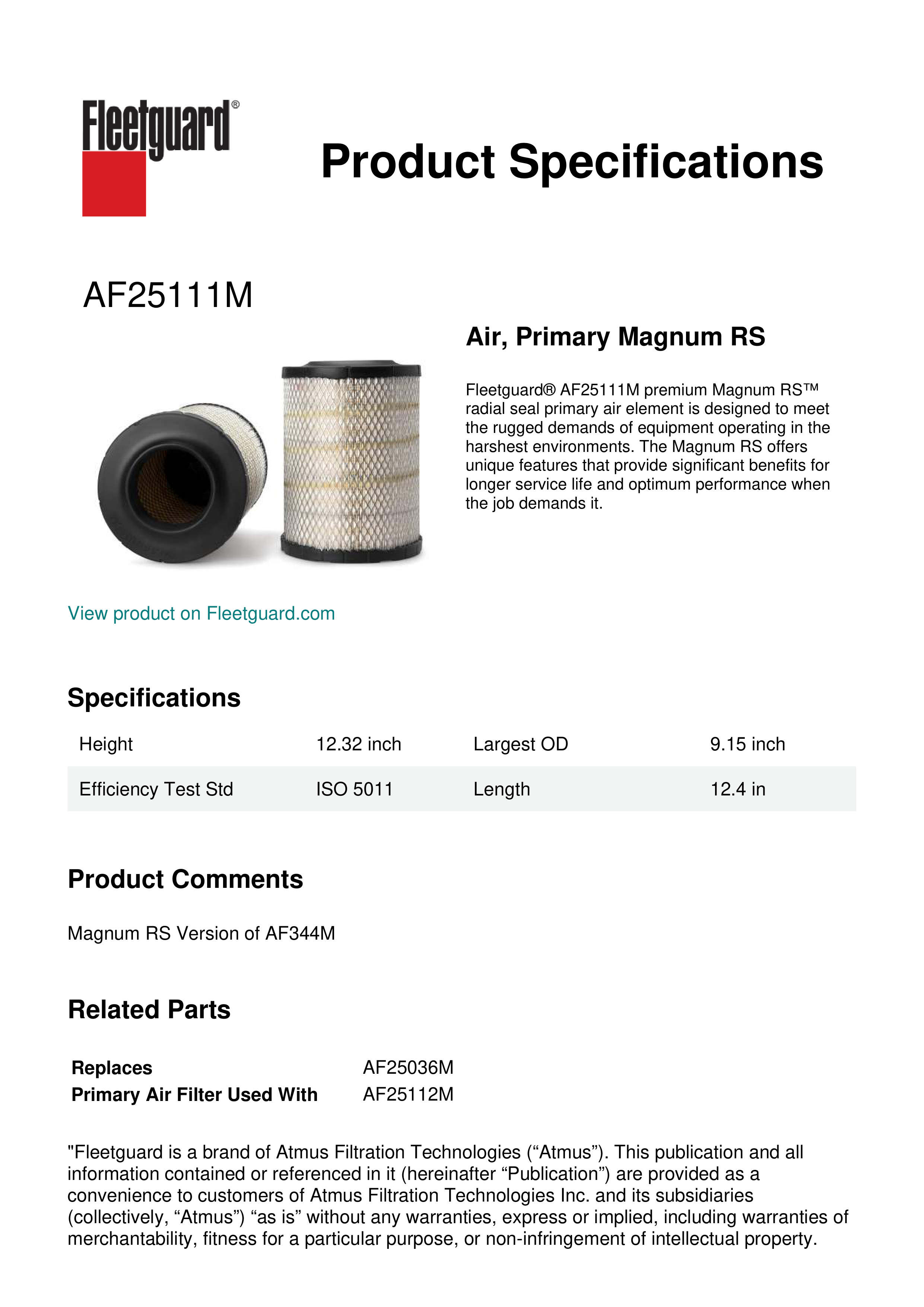 Fleetguard® AF25111M premium Magnum RS™ radial seal primary air element is designed to meet the rugged demands of equipment operating in the harshest environments. The Magnum RS offers unique features that provide significant benefits for longer service life and optimum performance when the job demands it.Specification