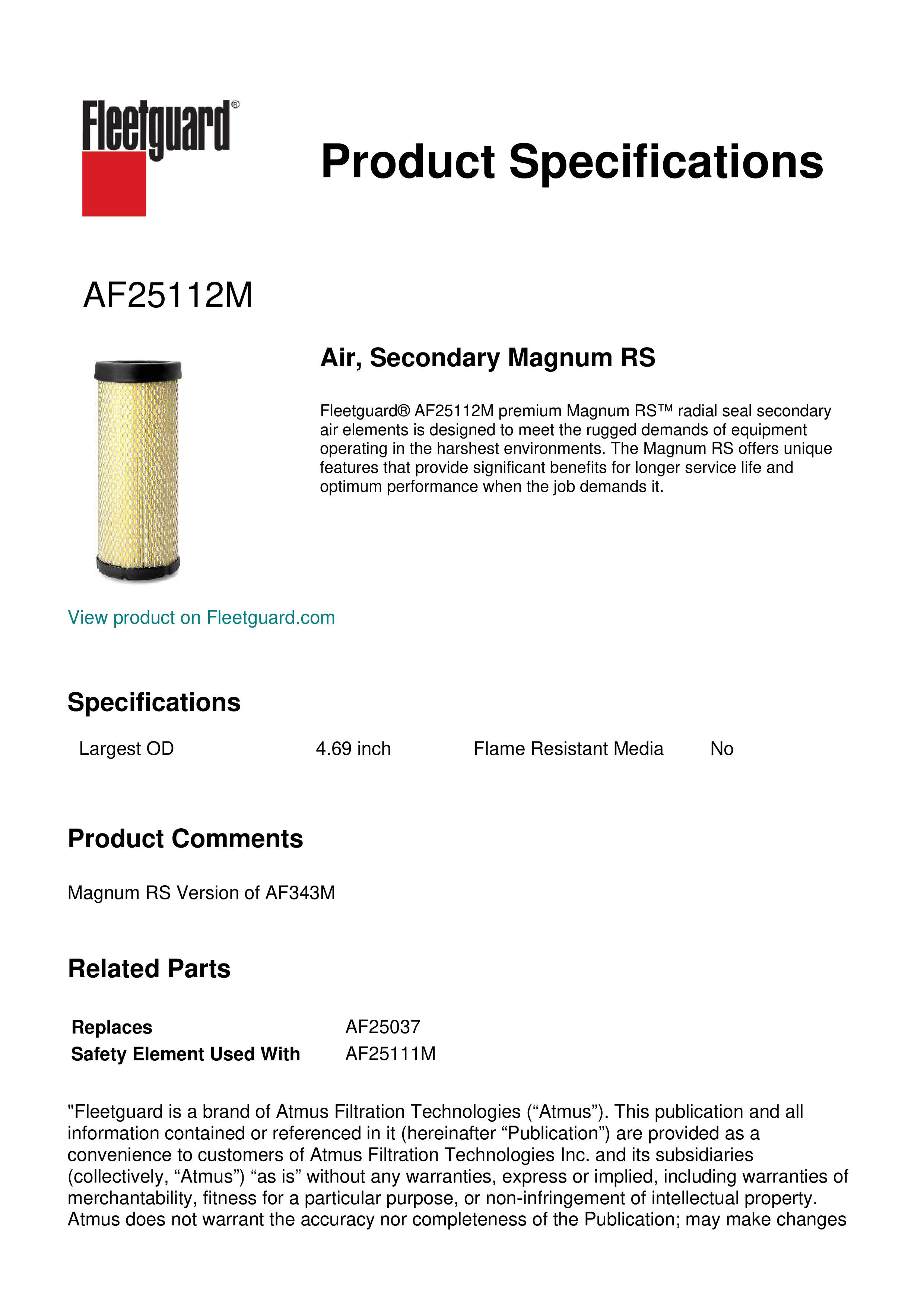 Fleetguard® AF25112M premium Magnum RS™ radial seal secondary air elements is designed to meet the rugged demands of equipment operating in the harshest environments. The Magnum RS offers unique features that provide significant benefits for longer service life and optimum performance when the job demands it.Specification