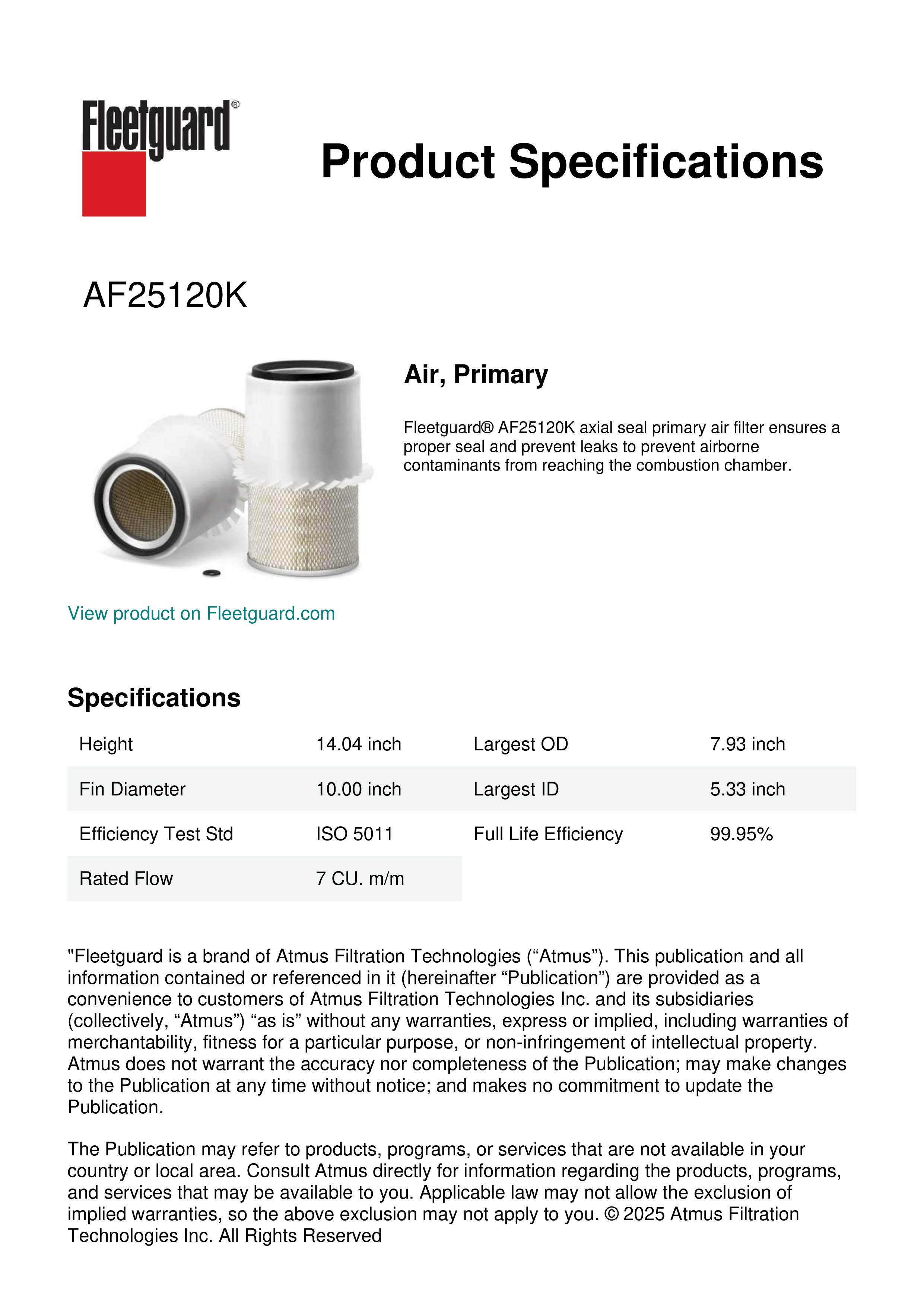 Fleetguard® AF25120K axial seal primary air filter ensures a proper seal and prevent leaks to prevent airborne contaminants from reaching the combustion chamber.Specification