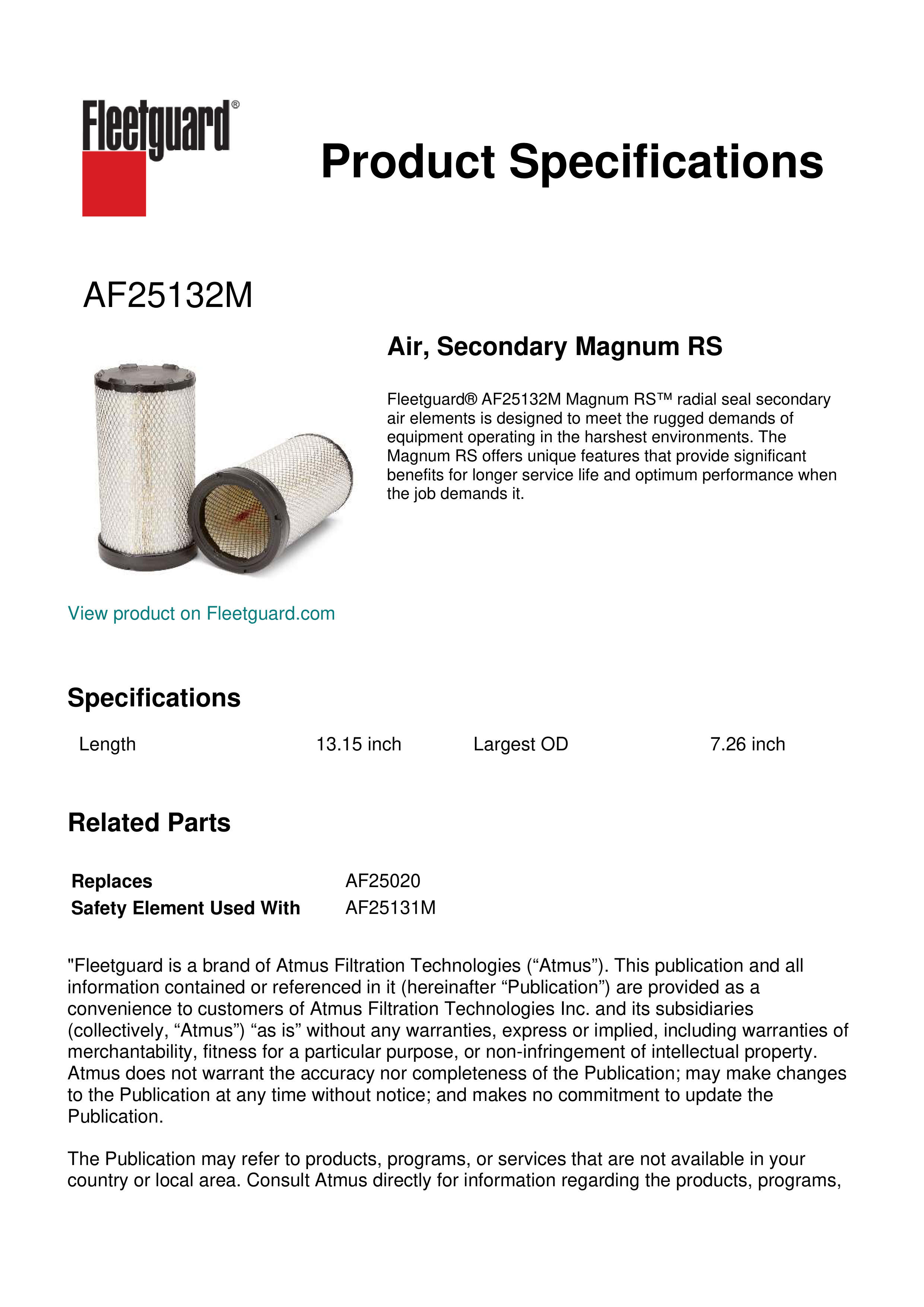 Fleetguard® AF25132M Magnum RS™ radial seal secondary air elements is designed to meet the rugged demands of equipment operating in the harshest environments. The Magnum RS offers unique features that provide significant benefits for longer service life and optimum performance when the job demands it.
