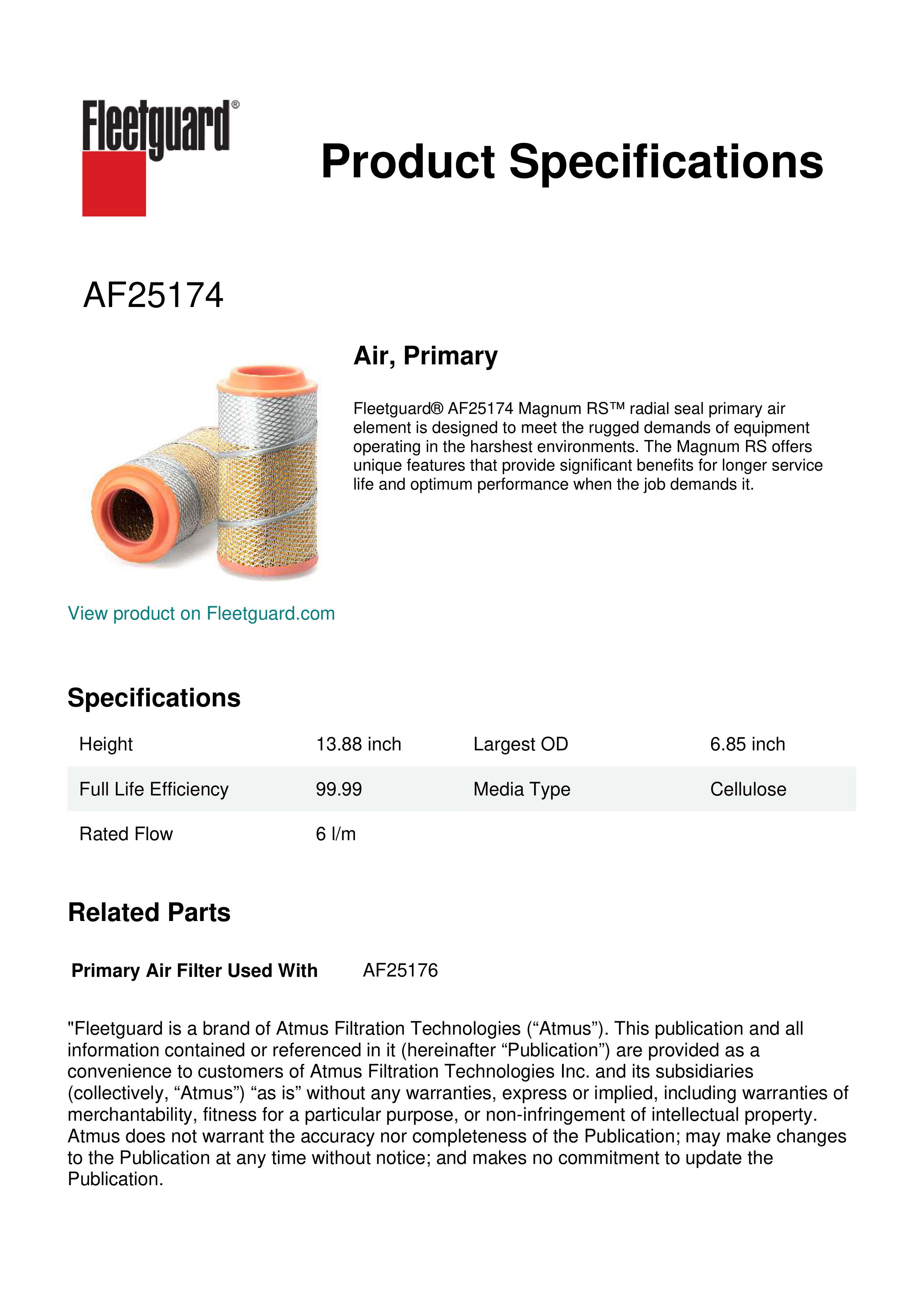 Fleetguard® AF25174 Magnum RS™ radial seal primary air element is designed to meet the rugged demands of equipment operating in the harshest environments. The Magnum RS offers unique features that provide significant benefits for longer service life and optimum performance when the job demands it.Specification
