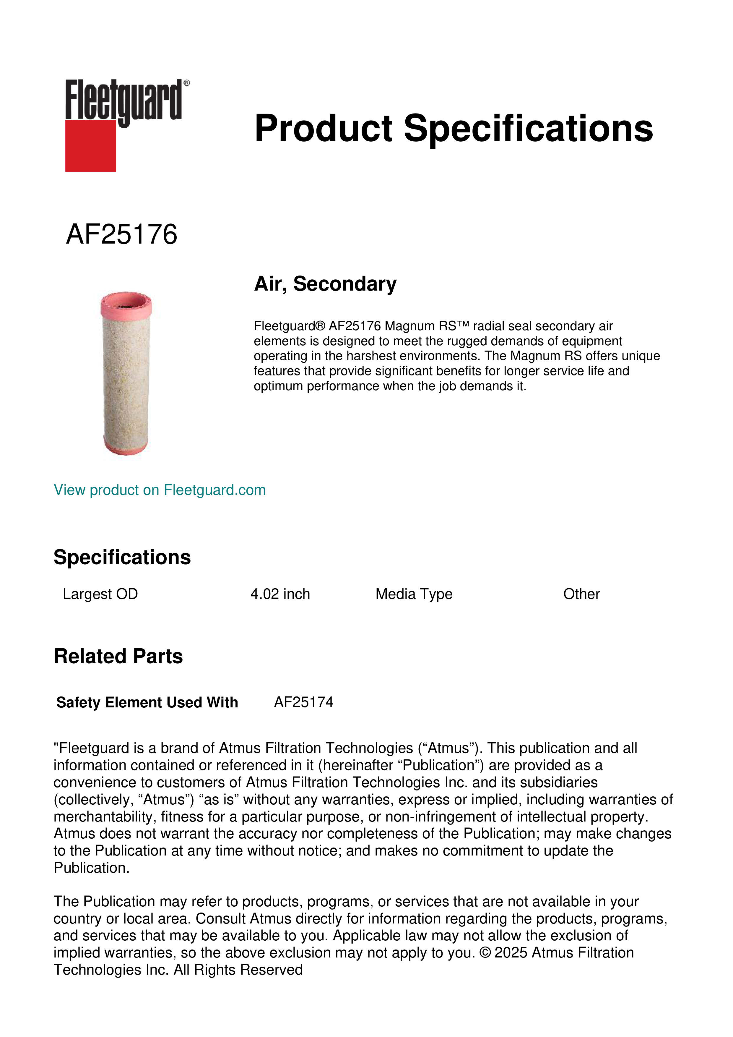 Fleetguard® AF25176 Magnum RS™ radial seal secondary air elements is designed to meet the rugged demands of equipment operating in the harshest environments. The Magnum RS offers unique features that provide significant benefits for longer service life and optimum performance when the job demands it.Specification