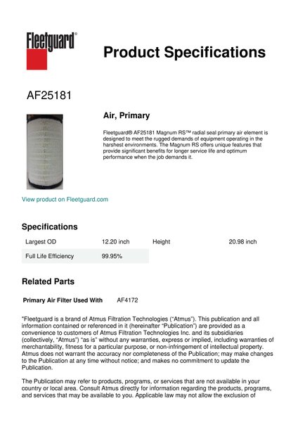 Fleetguard® AF25181 Magnum RS™ radial seal primary air element is designed to meet the rugged demands of equipment operating in the harshest environments. The Magnum RS offers unique features that provide significant benefits for longer service life and optimum performance when the job demands it.Specification