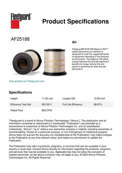 Fleetguard® AF25188 Magnum RS™ radial seal primary air element is designed to meet the rugged demands of equipment operating in the harshest environments. The Magnum RS offers unique features that provide significant benefits for longer service life and optimum performance when the job demands it.Specification