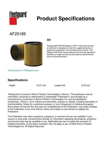 Fleetguard® AF25189 Magnum RS™ radial seal primary air element is designed to meet the rugged demands of equipment operating in the harshest environments. The Magnum RS offers unique features that provide significant benefits for longer service life and optimum performance when the job demands it.Specification