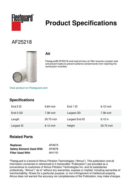Fleetguard® AF25218 axial seal primary air filter ensures a proper seal and prevent leaks to prevent airborne contaminants from reaching the combustion chamber.