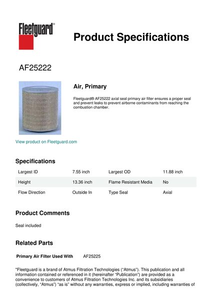 Fleetguard® AF25222 axial seal primary air filter ensures a proper seal and prevent leaks to prevent airborne contaminants from reaching the combustion chamber.