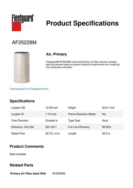 Fleetguard® AF25228M axial seal primary air filter ensures a proper seal and prevent leaks to prevent airborne contaminants from reaching the combustion chamber.