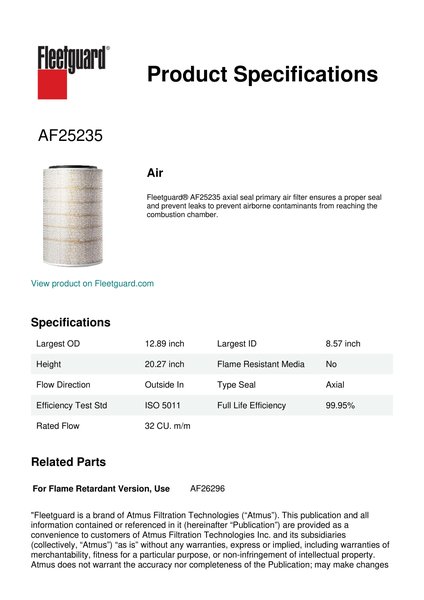 Fleetguard® AF25235 axial seal primary air filter ensures a proper seal and prevent leaks to prevent airborne contaminants from reaching the combustion chamber.