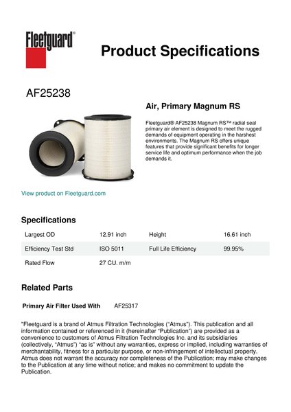 Fleetguard® AF25238 Magnum RS™ radial seal primary air element is designed to meet the rugged demands of equipment operating in the harshest environments. The Magnum RS offers unique features that provide significant benefits for longer service life and optimum performance when the job demands it.Specification