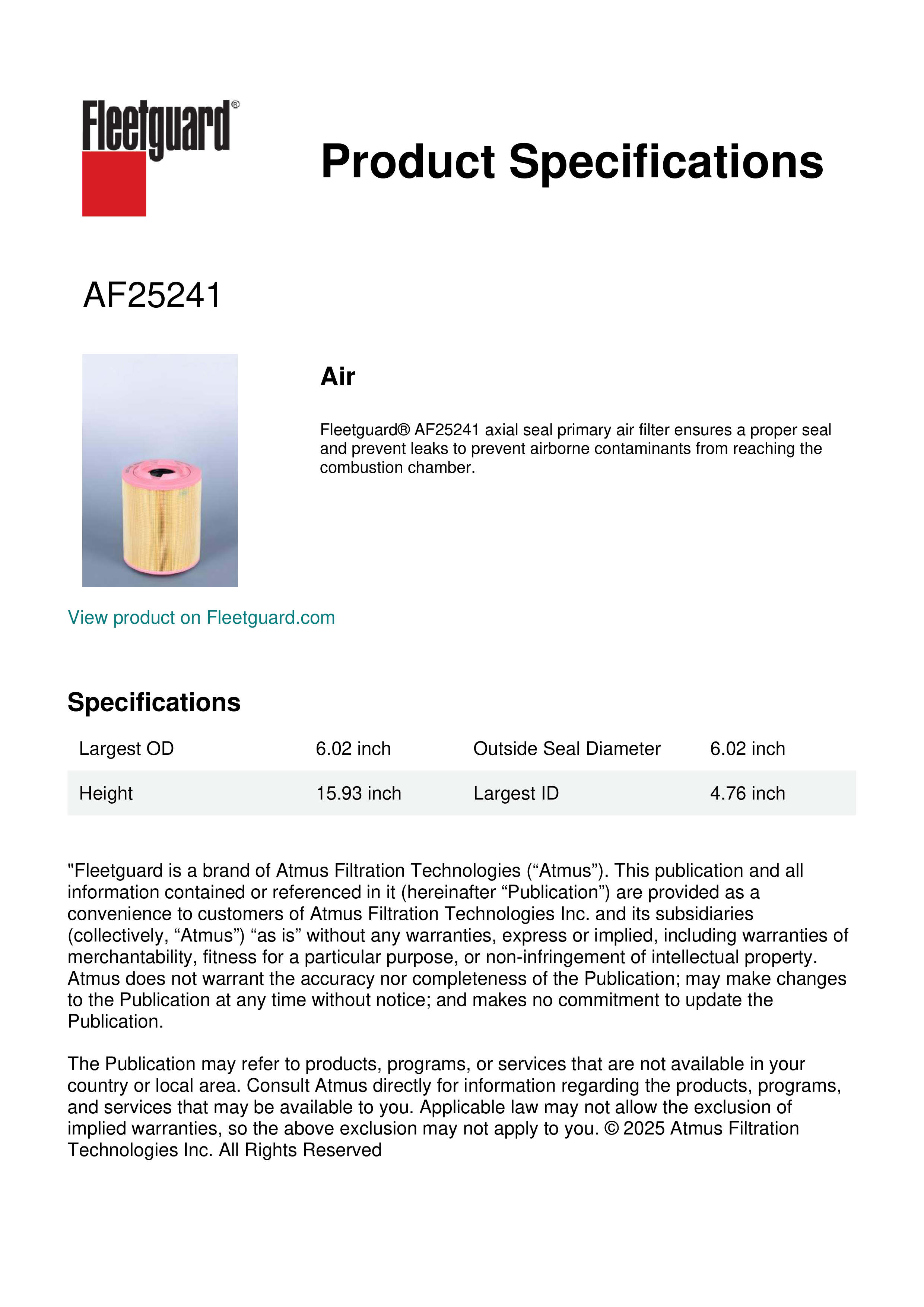 Fleetguard® AF25241 axial seal primary air filter ensures a proper seal and prevent leaks to prevent airborne contaminants from reaching the combustion chamber.
