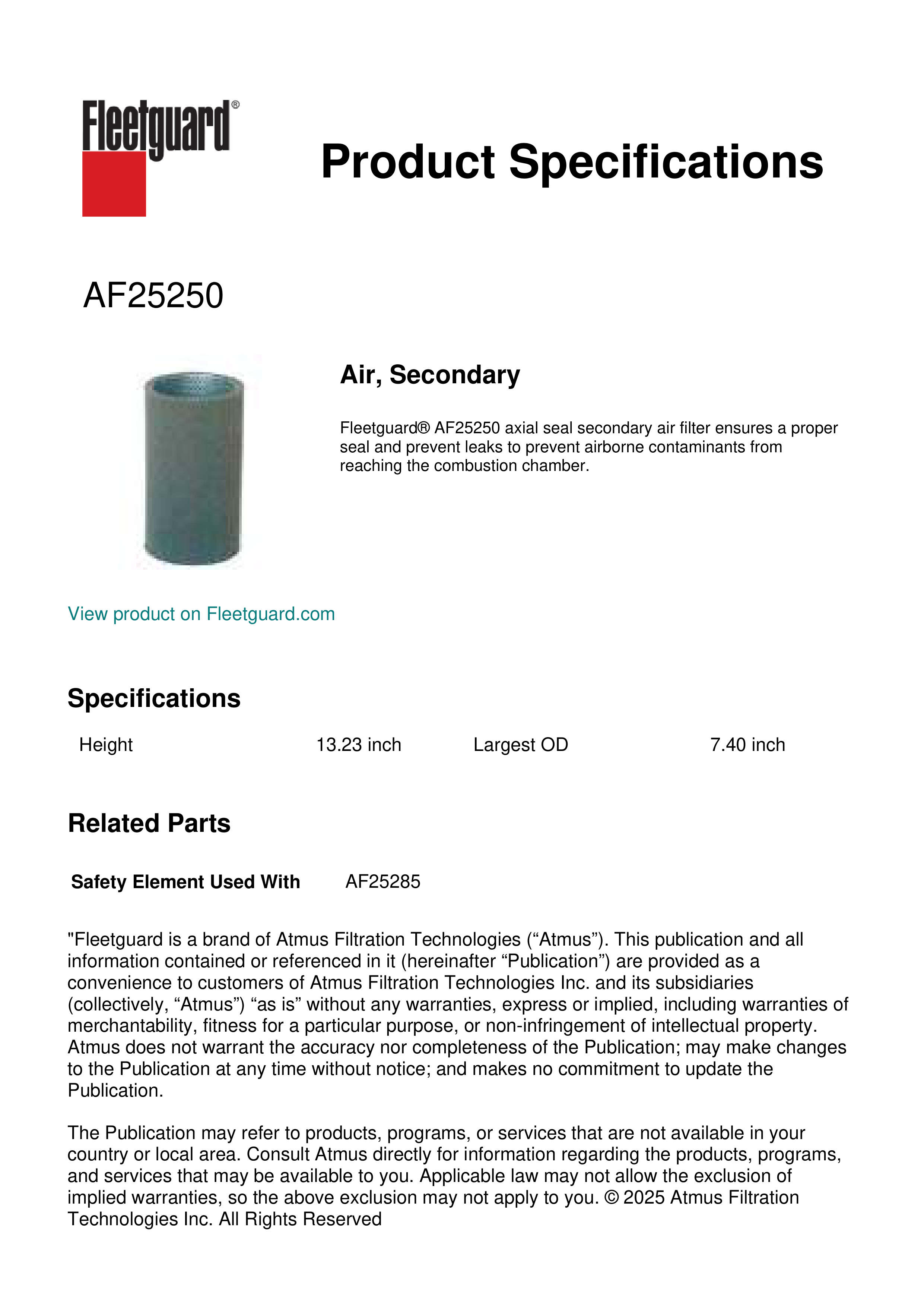 Fleetguard® AF25250 axial seal secondary air filter ensures a proper seal and prevent leaks to prevent airborne contaminants from reaching the combustion chamber.