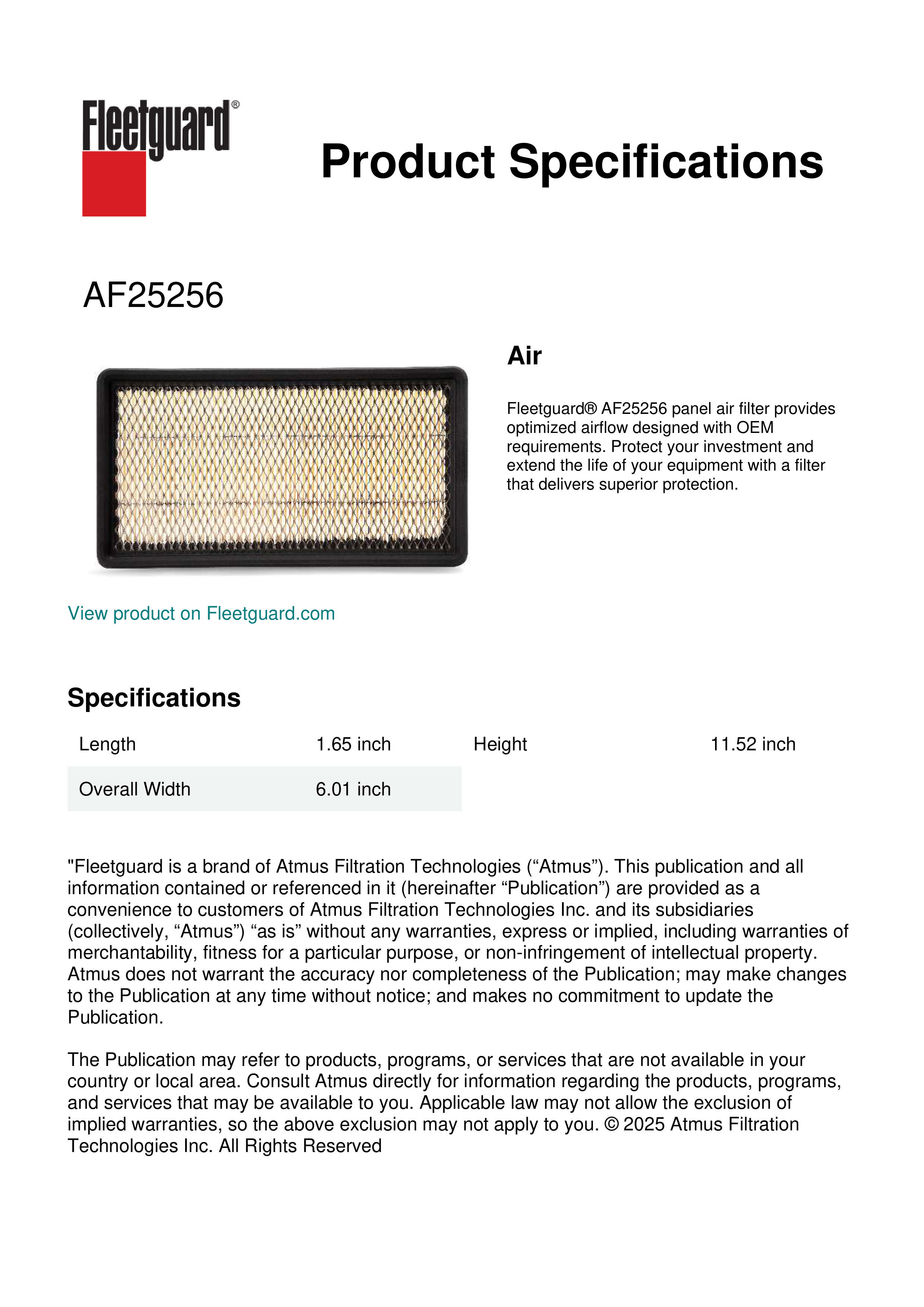 Fleetguard® AF25256 panel air filter provides optimized airflow designed with OEM requirements. Protect your investment and extend the life of your equipment with a filter that delivers superior protection.Specification