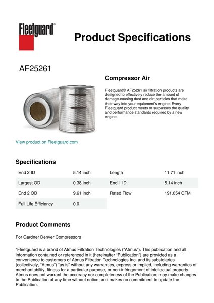 Fleetguard® AF25261 air filtration products are designed to effectively reduce the amount of damage-causing dust and dirt particles that make their way into your equipment’s engine. Every Fleetguard product meets or surpasses the quality and performance standards required by a new engine.Specification