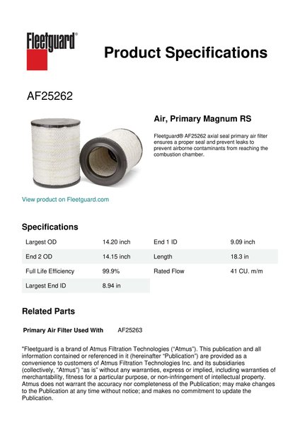 Fleetguard® AF25262 axial seal primary air filter ensures a proper seal and prevent leaks to prevent airborne contaminants from reaching the combustion chamber.