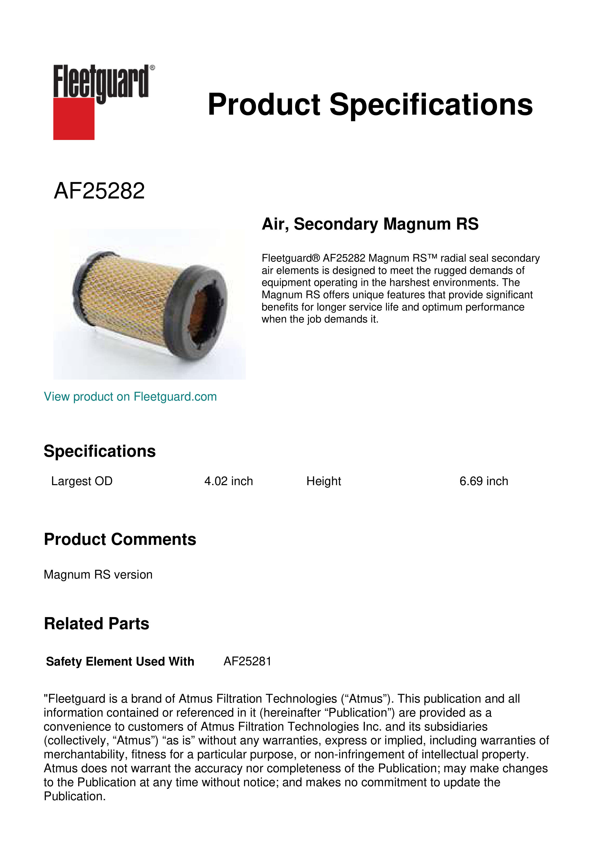 Fleetguard® AF25282 Magnum RS™ radial seal secondary air elements is designed to meet the rugged demands of equipment operating in the harshest environments. The Magnum RS offers unique features that provide significant benefits for longer service life and optimum performance when the job demands it.Specification