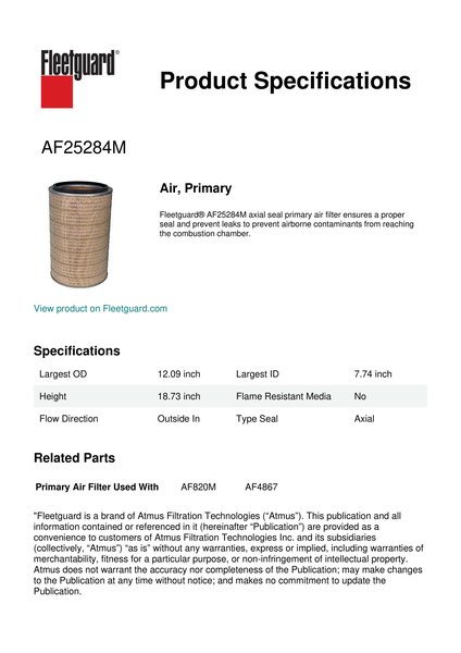 Fleetguard® AF25284M axial seal primary air filter ensures a proper seal and prevent leaks to prevent airborne contaminants from reaching the combustion chamber.