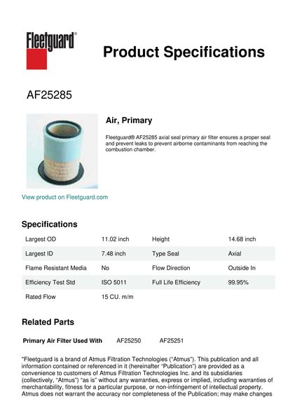 Fleetguard® AF25285 axial seal primary air filter ensures a proper seal and prevent leaks to prevent airborne contaminants from reaching the combustion chamber.