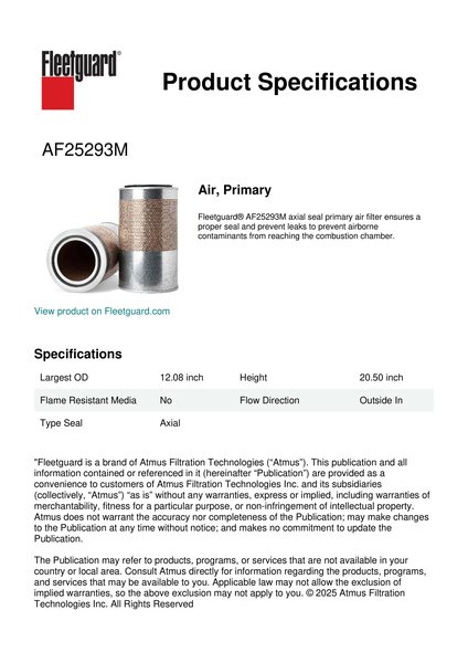 Fleetguard® AF25293M axial seal primary air filter ensures a proper seal and prevent leaks to prevent airborne contaminants from reaching the combustion chamber.