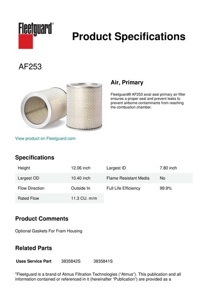 Fleetguard® AF253 axial seal primary air filter ensures a proper seal and prevent leaks to prevent airborne contaminants from reaching the combustion chamber.