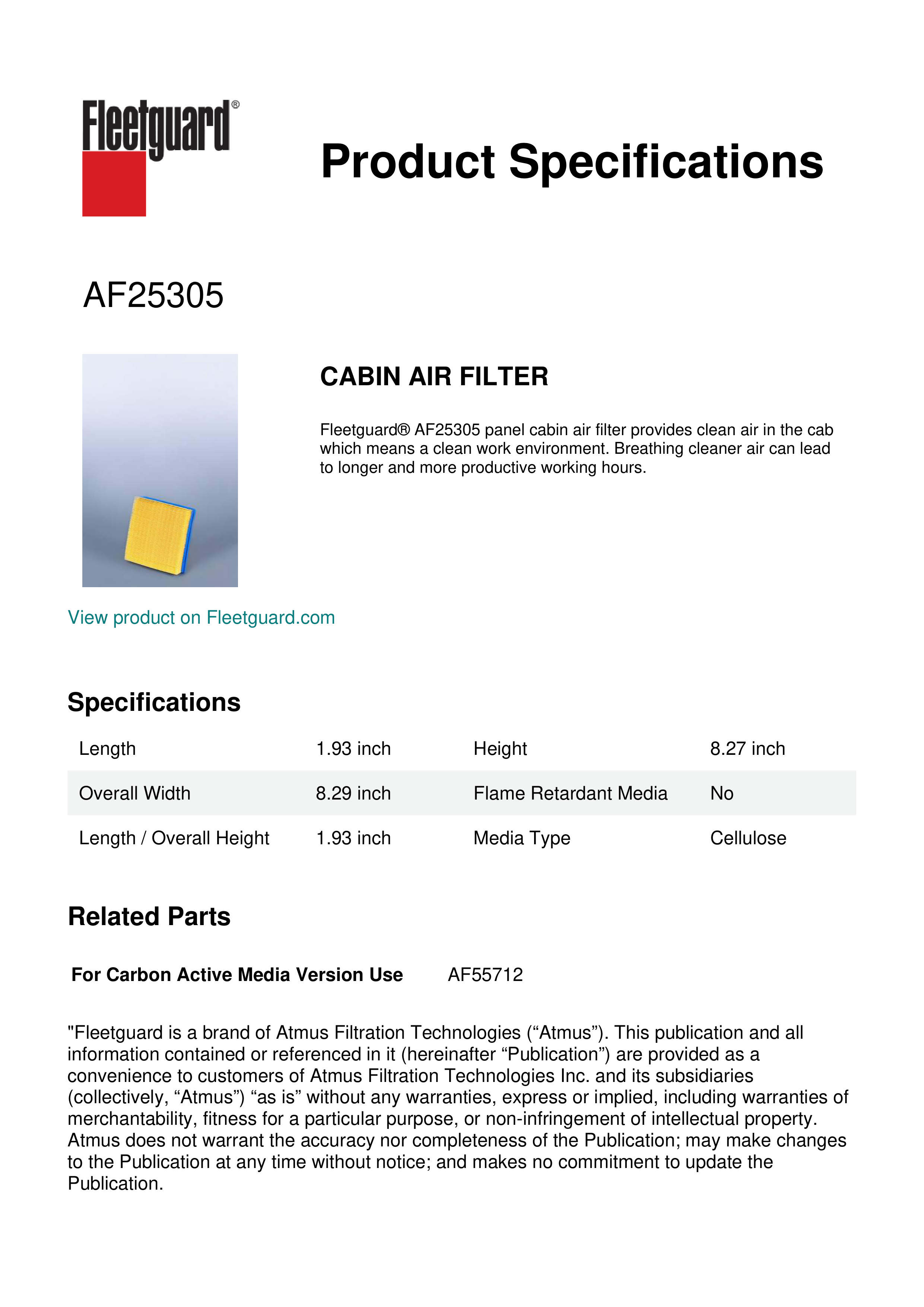 Fleetguard® AF25305 panel cabin air filter provides clean air in the cab which means a clean work environment. Breathing cleaner air can lead to longer and more productive working hours.Specification