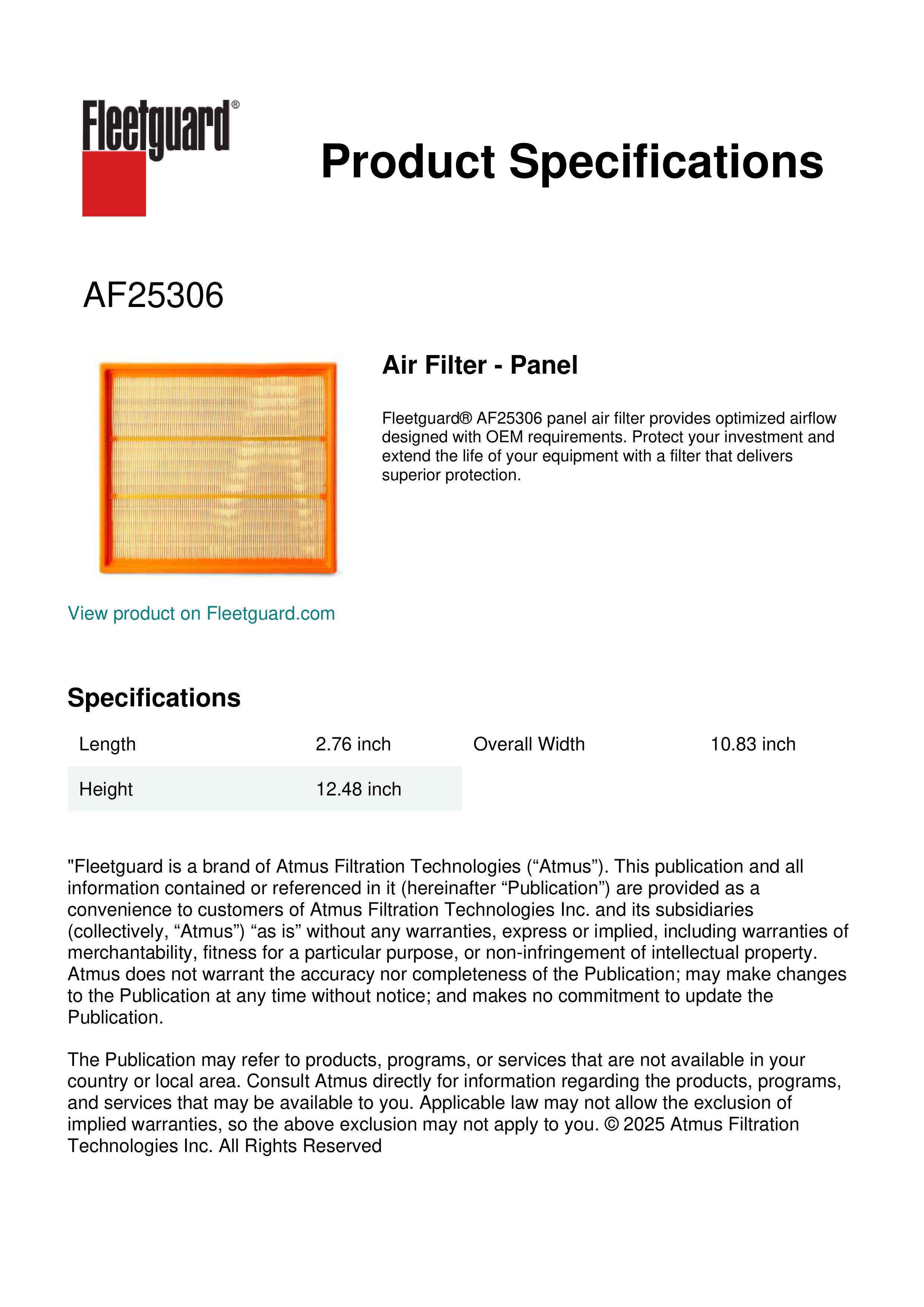 Fleetguard® AF25306 panel air filter provides optimized airflow designed with OEM requirements. Protect your investment and extend the life of your equipment with a filter that delivers superior protection.Specification